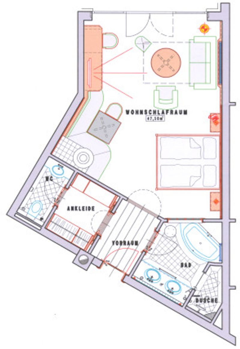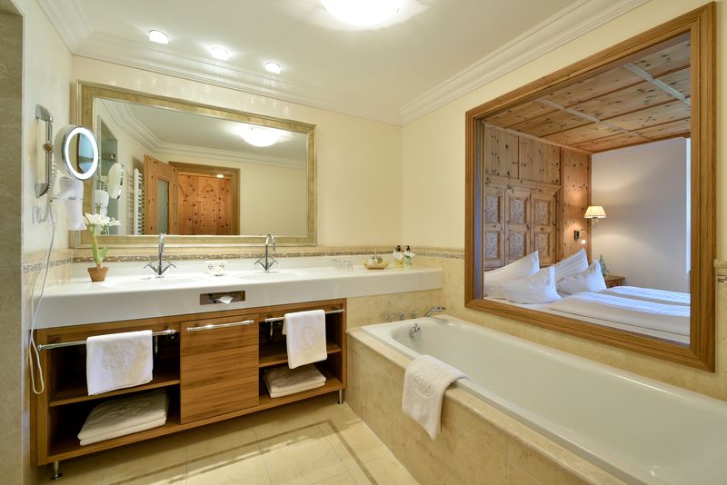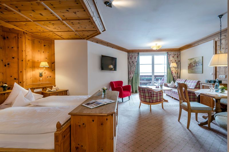Schlaf-Wohnbereich mit gemütlicher Sofagarnitur ( Sclafcouch für 2 Personen), Sitzecke, Schreibtisch sowie einem begehbaren Kleiderschrank, Kachelofen und Balkon, großes Badezimmer mit Doppelwaschbecken, Fön, Badewanne, große Walk-in-Dusche, separates WC, TV (86 Kanäle), Internet, Telefon, Bücherbox, Minibar, Safe, Post-Rucksack, Post-Schirm, Badetasche für die Zeit Ihres Aufenthaltes