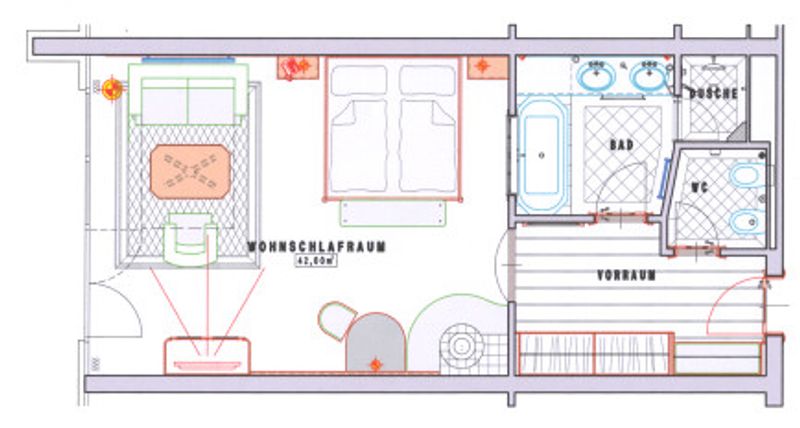 Großes Badezimmer mit Doppelwaschbecken, Föhn, Badewanne, große Walk-in-Dusche, separates WC, TV (86 Kanäle), Internet, Telefon, Bücherbox, Minibar, Safe, Post-Rucksack, Post-Schirm. Ihre Badetasche für die Zeit Ihres Aufenthaltes mit Handtuch, Bademantel, Badeschuhe wartet auf dem Zimmer auf Sie !Abweichungen in Grundriß und Holzart je nach Stockwerk.