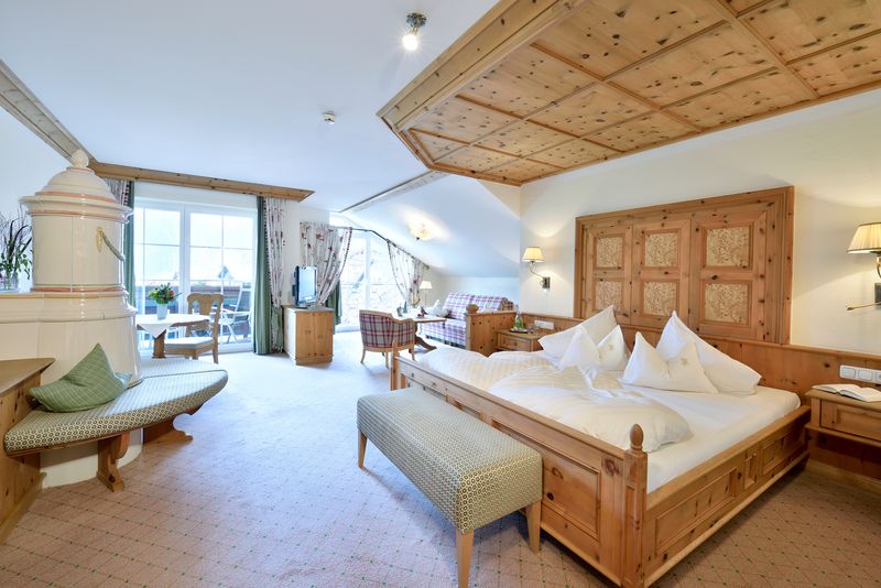 großzügiger Schlaf-Wohnbereich mit gemütlicher Sofagarnitur ( kann als Schlafcouch für 2 Personen genutzt werden) , Sitzecke, Schreibtisch, Kachelofen und Balkon - viel Platz für Ihre Erholung !